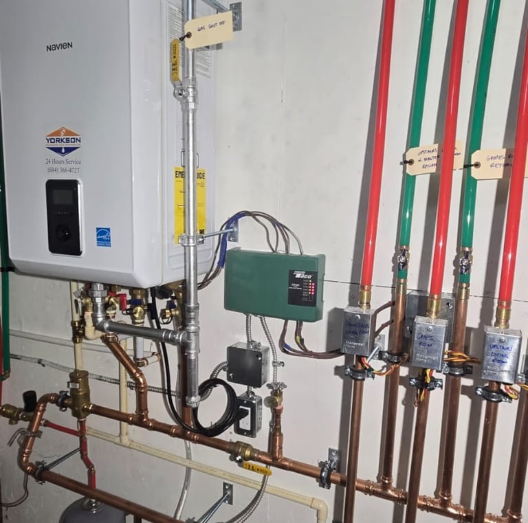 On the plumbing side, we handle full rough ins, residential and commercial repipes, fixtures, Kitchen faucets & Garburators installations, sump and drainage systems, water service upgrades, PRV replacements, backflow device testing, leak detection, drain cleaning & Drain camera inspections. We work closely with homeowners, strata councils, and property managers to deliver code compliant installations that meet BC Building Code and Technical Safety BC requirements.